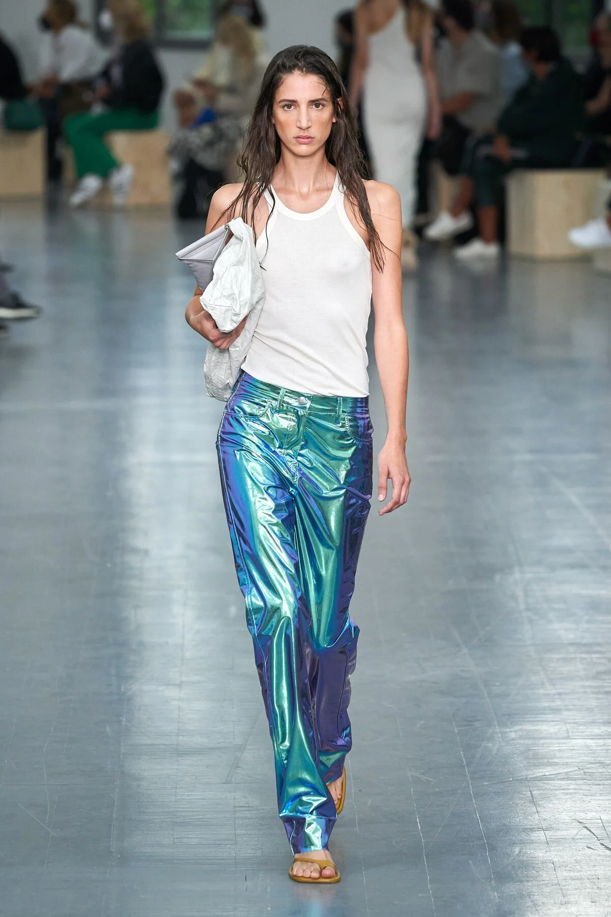 Acne Studios, Sportmax, and Tom Ford added a touch of luxury to classic thong sandals. In a nod to early 2000s fashion, models sported chunky platform flip-flops at Jacquemus, while Stella McCartney played with proportions in a sporty style with plush padding. For their take on Spring 2021's must-have accessory, Balenciaga, Rosetta Getty, and Gabriela Hearst chose slipper-like slides that could easily be worn inside.